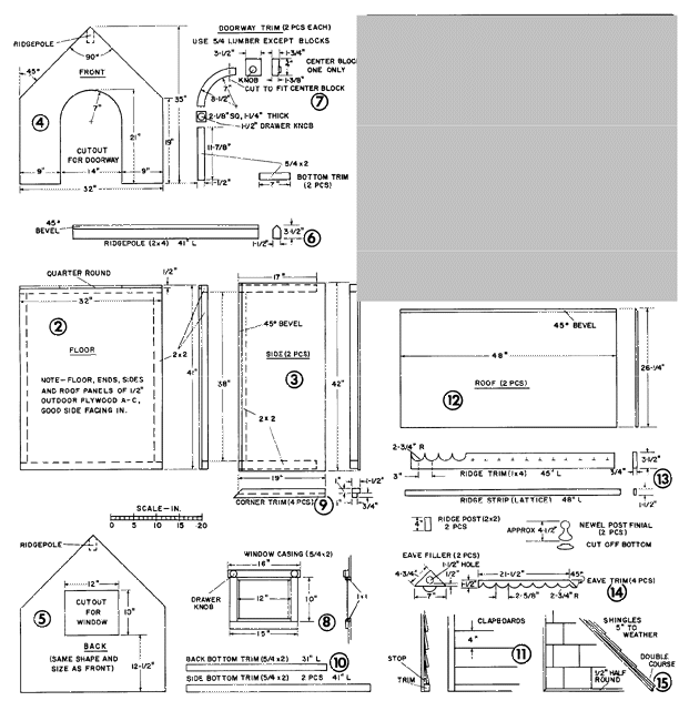 Figure 1 gives the major components of the doghouse and shows how the parts are fitted together. As you see, the basic structure - floor, sides, ends and roof - is made of 1/2-inch plywood with 2 x 2 cleats nailed to the panels so they may be nailed together. Over the basic shell goes all the fancy stuff - trim, clapboard siding, gingerbread at peak and eaves, and wood roof shingles.