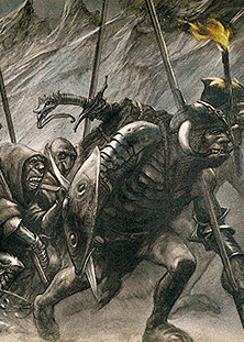 OrcOrcs (also known as Orch, Yrch, Glamhoth, Gorgûn, Goblin, Hobgoblin) are the most famous of Tolkien´s creatures. They are born warriors and were used by Morgoth, Sauron, the With-king, the Balrog and Saruman. Some say that they originate from the elves, that they were remade by Morgoth who is said to have captured Avari (dark elves) for his own dark purpose of creating an army. Orcs tend to be short, squat and bow-legged, with long arms, dark faces, squinty eyes, and long fangs. Most orcs, except for the Uruk-hai, are weakened by the sun, and all prefer the dark. Orcs hate all things of beauty and love to kill and destroy.