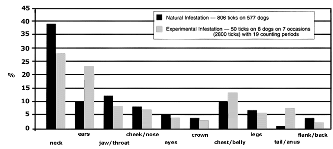 Bancroft, in 1884, observed that the Australian paralysis tick usually attached "about the head and ears" of dogs (Bancroft, 1884). A recent survey (Atwell et al, 2000) has confirmed that the head and neck account for 70% of attached ticks in both naturally acquired and experimental infestations. This was despite the fact that in the experimental infestations 50 ticks were evenly dispersed along the dorsum (head, neck and back) of each dog. Additionally it was found that significantly more ticks attached to the chest and belly than to the crown, back and flanks, suggesting a preference for attachment to ventral sites.