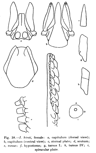Fig.38- I. hirsti, female: a, capitulum (dorsal view); b, capitulum (ventral view); c, sternal plate; d, scutum; e, coxae; f, hypostome; g, tarsus I; h, tarsus IV; I, spiracular plate