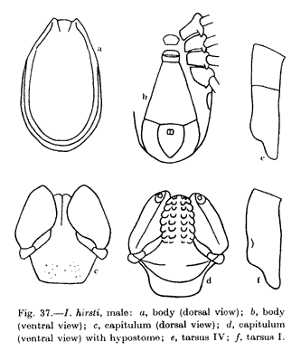 Fig. 37.-I.hirsti, male: a, body (dorsal view); b, body (ventral view); c, capitulum (dorsal view); d, capitulum (ventral view) with hypostome; e, tarsus IV; f, tarsus I.
