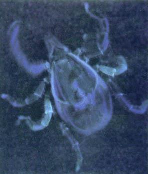 The figure shows UV fluorescence of the 3rd leg (from the head) and particularly the tips of the 4th leg. A line of fluorescence is also visible on the back of the tick down each side behind the head. The two lines meet at an area of irregularity associated with a mounting pin, but usually appear as a complete circle behind the head. Dead (and dehydrated) ticks do not fluoresce. Source: Atwell, R: Unusual Identification of Ixodes holocyclus; Aust Vet Practit 28(3), Sep 1998. Photgraphy, Prentice (modified to enhance effect).