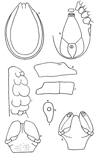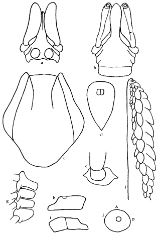 I. holocyclus: female; a, capitulum (dorsal view); b, capitulum (ventral view); c, palpal article I (lateral view); d, hypostome; e, scutum; f, anal grooves; g, spiracular plate; h, tarsus I; i, tarsus IV. | Fig. 36.-I. cornuatus, female: a, capitulum (dorsal view); b, capitulurn (ventral view); c, scutum; d, anal grooves; e, palpal article 1 (lateral view); f, hypostome; g coxae; h, tarsus I; i, tarsus IV; j, spiracular plate. |