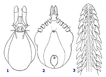 female, partially engorged 1, capitulum and scutum, dorsal aspect 2, ventral aspect 3, hypostome (from Neumann, 1899) |
